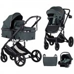 Carucior pentru copii Chipolino Elite 3 in 1 basil cu spatar reglabil, suspensii, maner ajustabil, suport picioare reglabil si accesorii