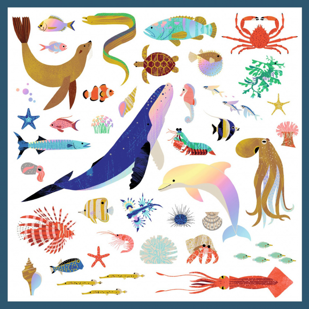 • O mapă cu 160 de abțibilduri cu tematica marina.. Peștele spadă, crabul pustnic, peștele-soarelui oceanic, căluțul de mare... atât de multe animale marine diferite și strălucitoare de descoperit!