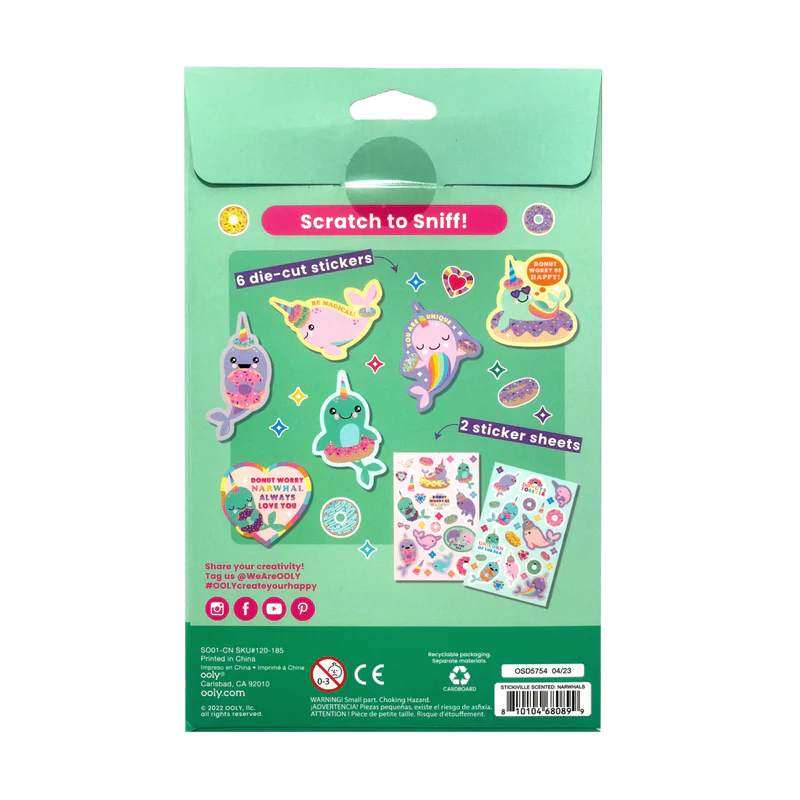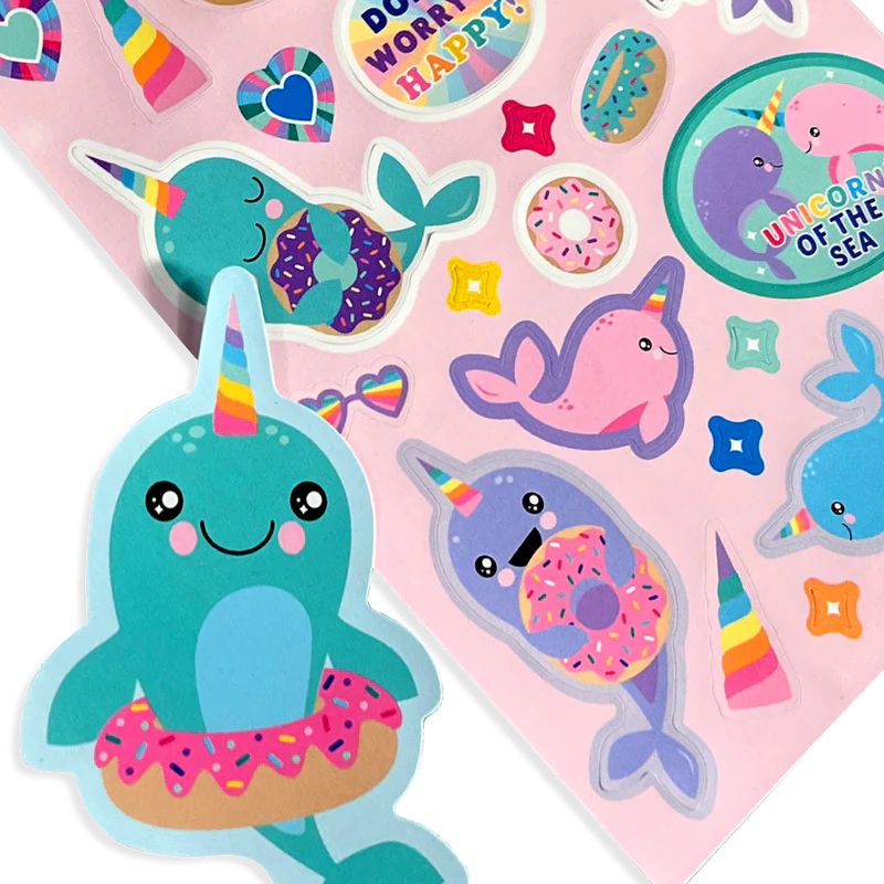 Aceste autocolante parfumate înfățișează narvalii făcând lucrurile lor preferate - mâncând gogoși și zâmbind!