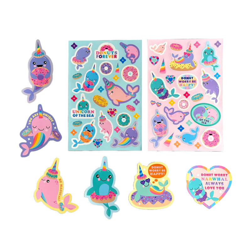 Autocolantele prezintă narvalii fericiți cu gogoși și mesaje dulci