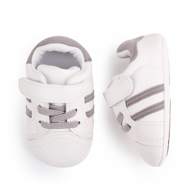 Adidasi pentru bebelusi din material tip piele ecologica, cu dungi gri si insertie din material tip piele intoarsa la spate. Se inchid cu sireturi din elastic si bareta cu arici.
