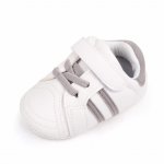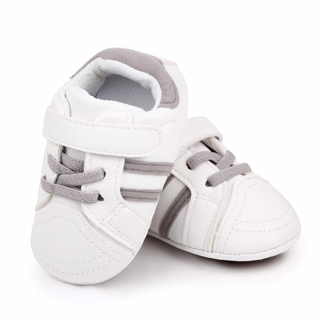 Adidasi pentru bebelusi din material tip piele ecologica, cu dungi gri si insertie din material tip piele intoarsa la spate. Se inchid cu sireturi din elastic si bareta cu arici.