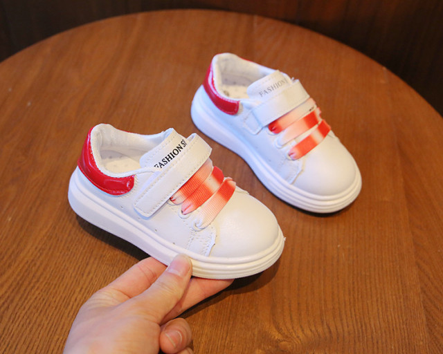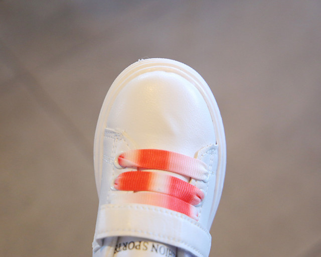 Adidasi pentru fetite, din material tip piele ecologica, se inchid cu bareta cu arici si sireturi in degrade din elastic.