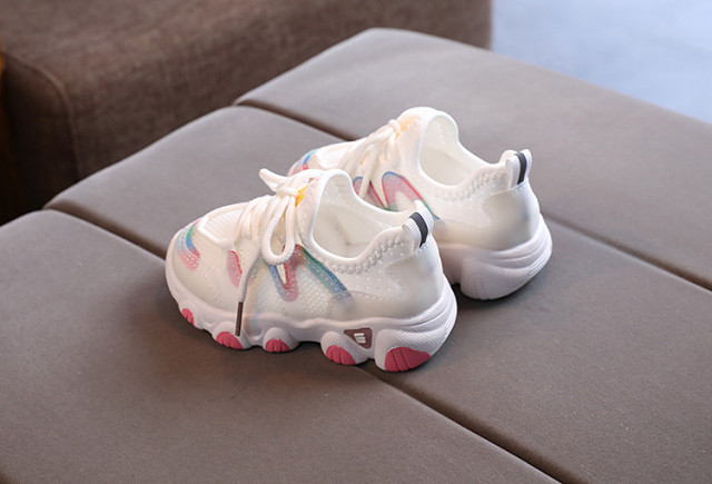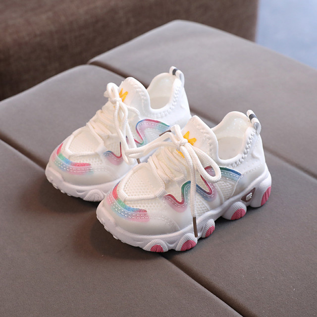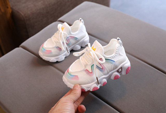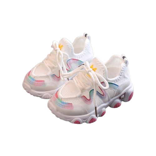 Adidasi pentru fetite din material textil, cu insertii laterale in valuri, colorate si cu sclipici fin. Se inchid cu bareta cu sireturi ajustabile.