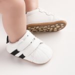 Adidasi bebelusi, din piele ecologica, de culoare alb cu detalii negre, prevazuti cu inchidere cu barete velcro pentru o fixare sigura si usoara.