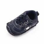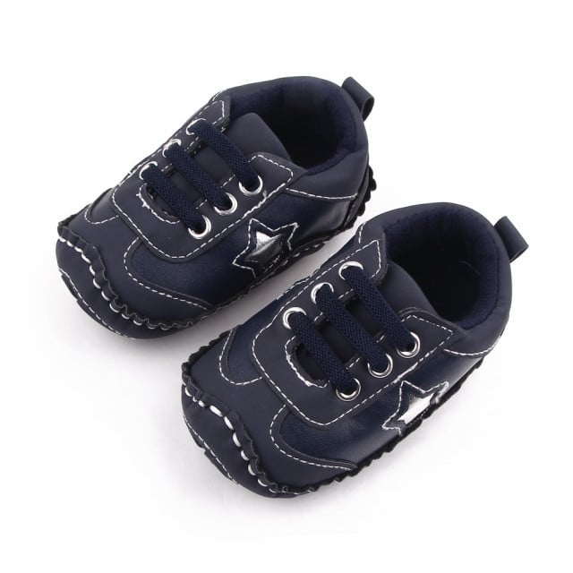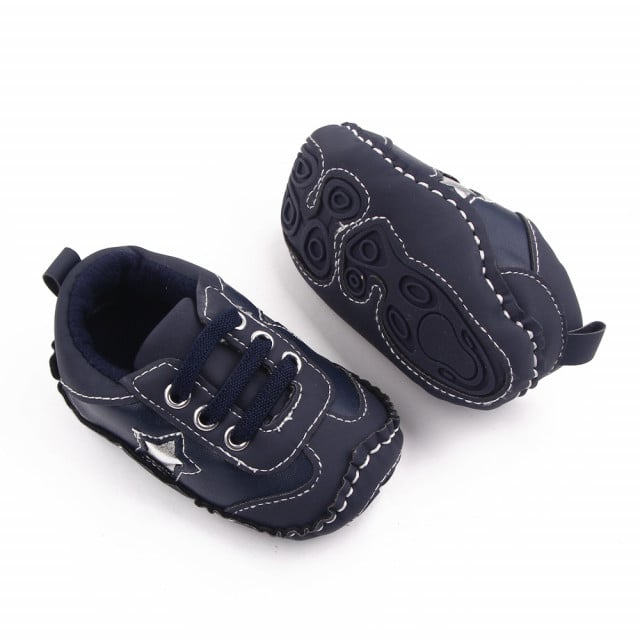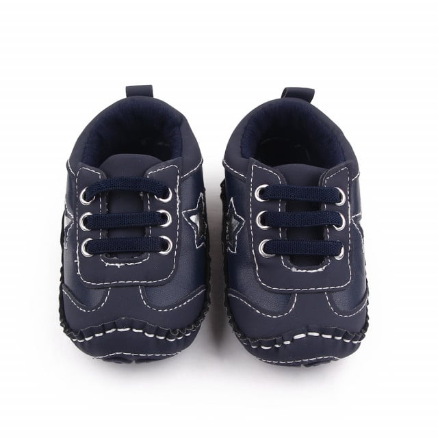 Adidasi pentru bebelusi din material tip piele ecologica, cu stelute aplicate in laterale. Se inchid cu sireturi din elastic.