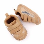 Adidasi pentru bebelusi din material tip piele ecologica, cu dunga argintie aplicata in laterale. Se inchid cu barete cu arici.