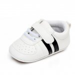 Adidasi pentru bebelusi din material tip piele ecologica, cu dungi negre, se inchid cu sireturi din elastic si bareta cu arici.