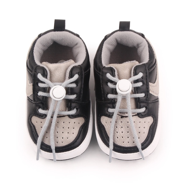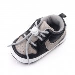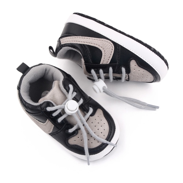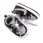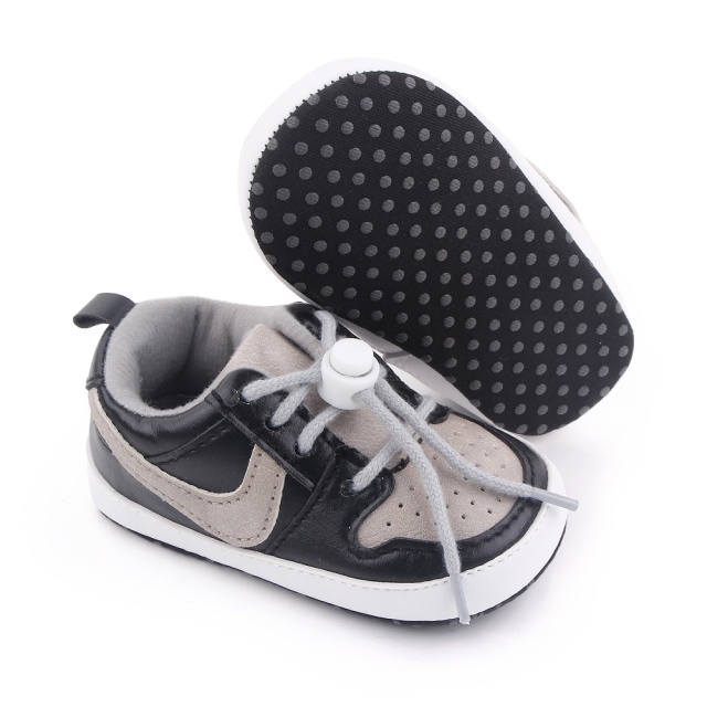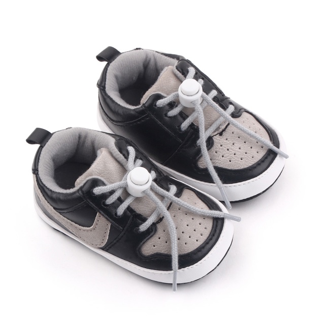 Ofera-i micutului tau un stil sportiv si modern cu acesti pantofi de bebelusi in nuante de negru si gri.