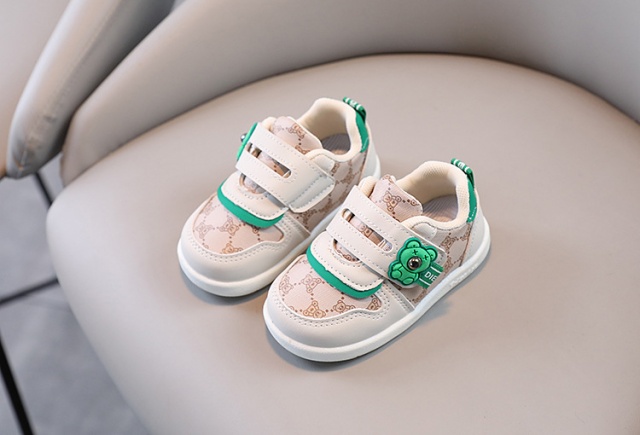 Adidasi pentru baietei, din material tip piele ecologica, se inchid cu bareta cu arici intr-o parte, pe care este aplicat un ursulet verde.