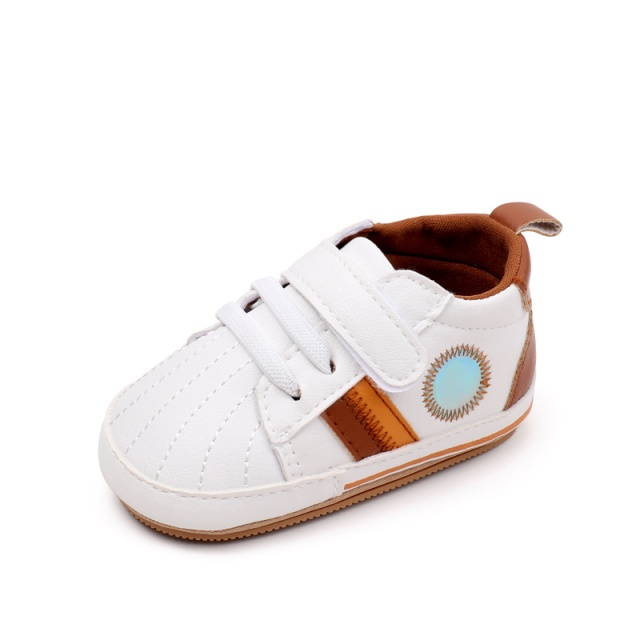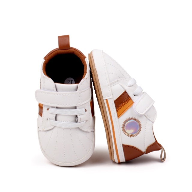 Ofera-i micutului tau un look modern si confortabil cu acesti adidasi pentru bebelusi in nuante de alb si maro.