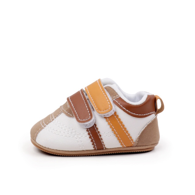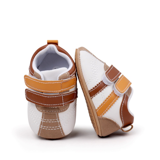 Pantofi sport pentru bebelusi, in nuante de maro si alb, cu inchidere dubla tip velcro pentru o fixare sigura si rapida.