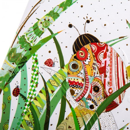 Este frumos decorata cu gargarite de marimi diferite pe fire de iarba in culori pastelate si este ornata cu linii si puncte fine din vopsea aurie pentru a evidentia designul copertii.