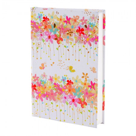 Agenda este infrumusetata de o serie de flori si fluturi in zbor, in culori pastel pe un fond alb si ornata cu linii si puncte fine din vopsea aurie.