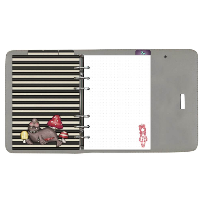 Agenda are coperti din piele ecologica cum am mai spus cu imprimeu Gorjuss Finding My Way. In interior veti gasi 200 de pagini cu desene simbolice designului si sunt prinse in 4 inele metalice.