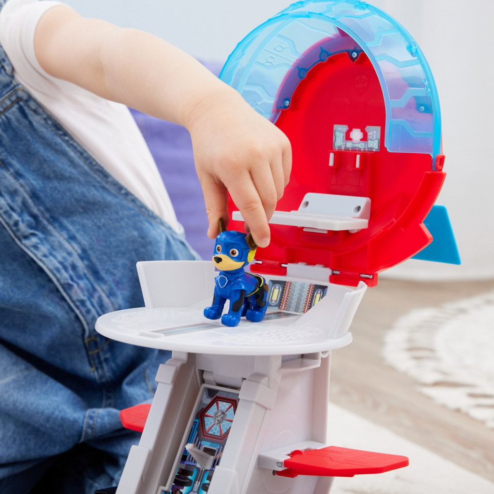 Masurand peste un metru lungime, aceasta jucarie portavion Patrula Catelusilor are lansatoare duble pentru vehicule, o figurina Chase de colectie si vehiculul sau Mighty Pups!