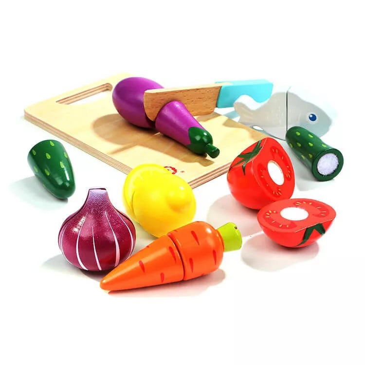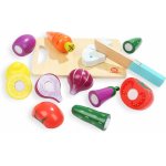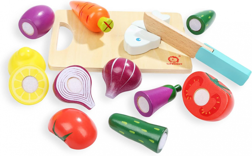 O colecție de 7 mâncăruri de feliat din lemn cu velcro și un cuțit, precum și un platou pentru tăiere și servire.