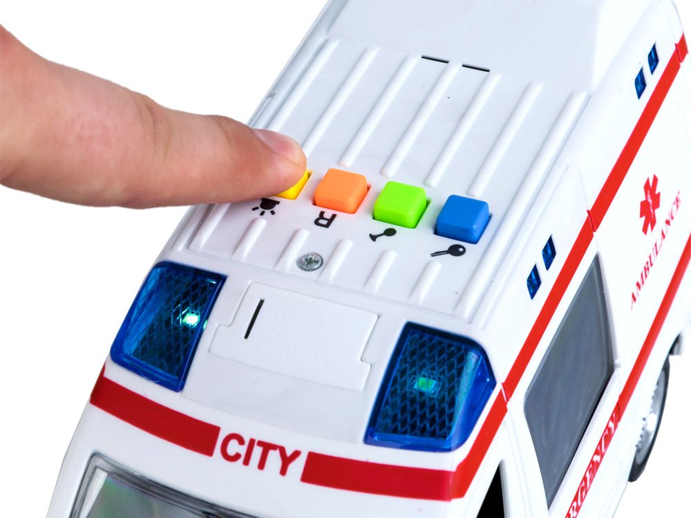 * Girofarul emite sunete si lumini, la fel ca o masina adevarata. Pentru sunete specifice ale ambulantei pot fi accesate cele 4 butoane plasate deasupra cabinei.