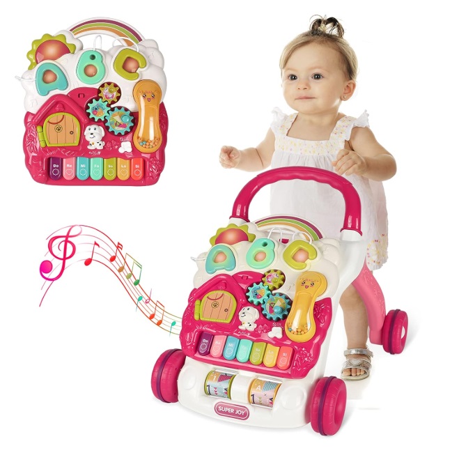 Antepremergator interactiv cu Pian muzical si Panou interactiv detasabil, Telefon, litere, angrenaje rotative si roti antiderapante, dimensiune 43 x 46.5 x 42.5 cm, Happy Pink