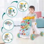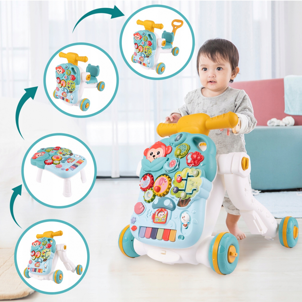 Antepremergator multifunctional 4 in 1, Premergator, Masuta de activitati si Trotineta, cu pian si sunete vesele, Blue Monkey
