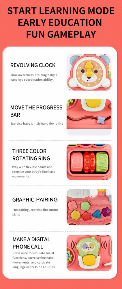 Centru de activitati complex: Include pian, angrenaje rotative, sortator de forme si alte jocuri educative, oferind o gama larga de activitati pentru a mentine copilul interesat si implicat.