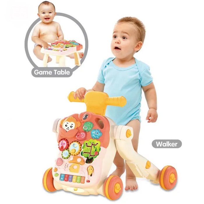 Antepremergator si masuta de activi 2 in 1 pentru copii, cu panou interactiv detasabil, telefon, activitati educative, butoane functionale, sunete, lumini, angrenaje rotative, roti antiderapante, pink