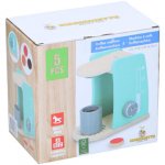 Filtru de cafea din lemn cu o ceașcă din lemn și trei „capsule” de cafea diferite.