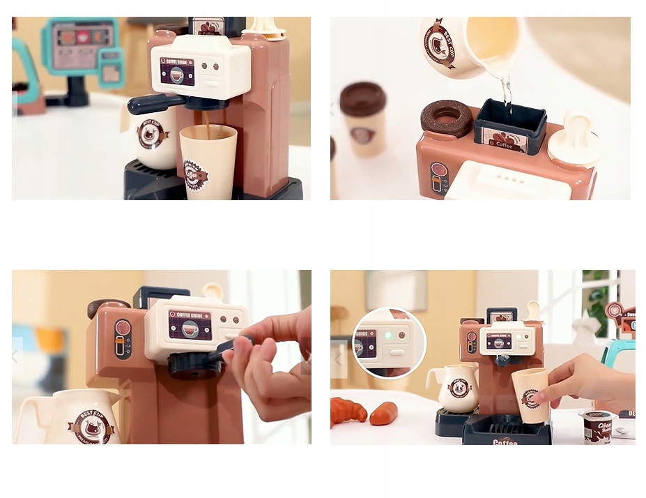 Copiilor le place sa urmareasca adultii, care fac adesea primii pasi catre aparatul de cafea dimineata, asa ca acest echipament este perfect pentru ca copilul sa isi poata prepara singur cafeaua si sa o serveasca papusilor si ursuletilor de plus.