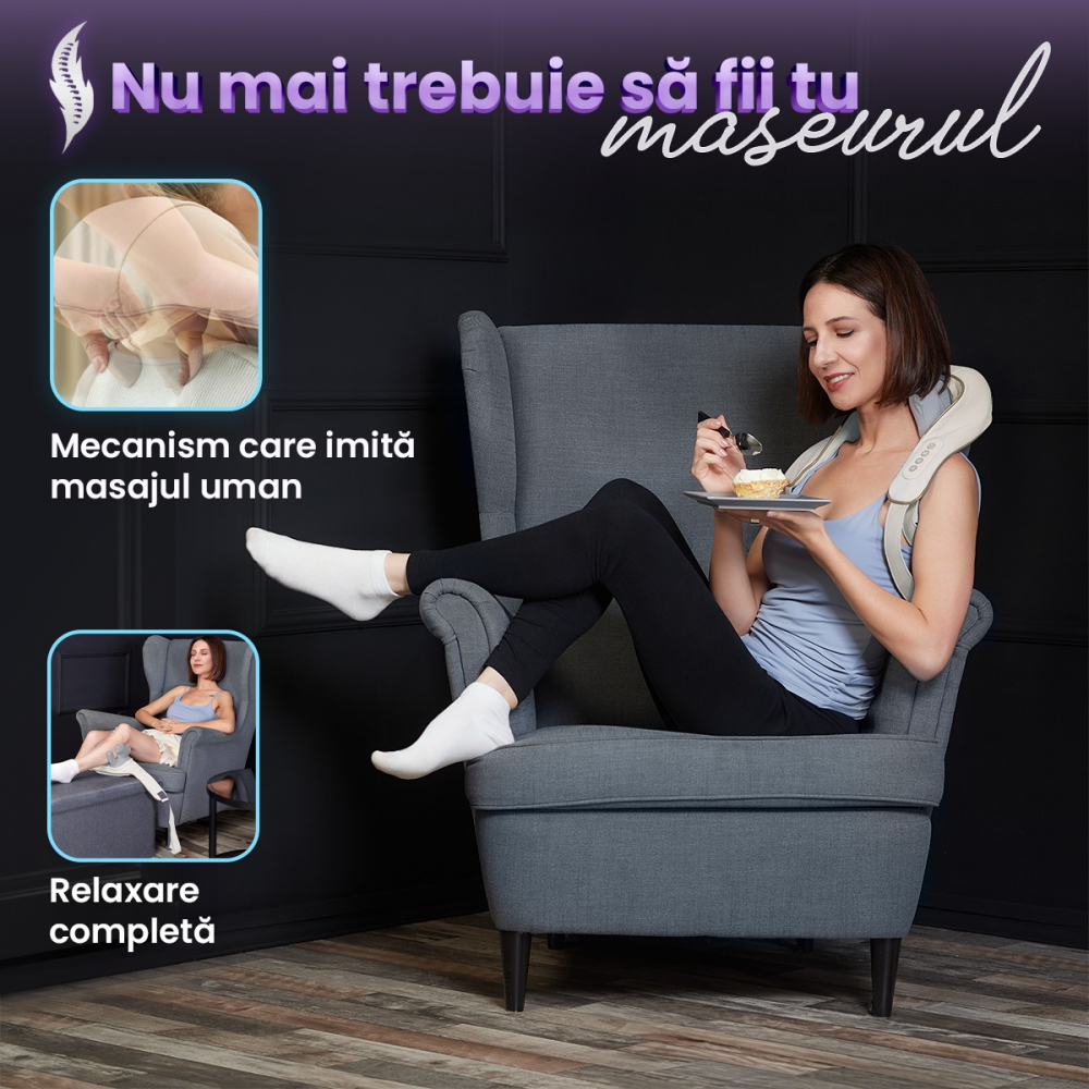 Acest dispozitiv inovator este conceput pentru a simula un masaj uman natural, oferindu-ți exact ceea ce ai nevoie pentru a reduce stresul și oboseala, îmbunătățindu-ți starea de bine.