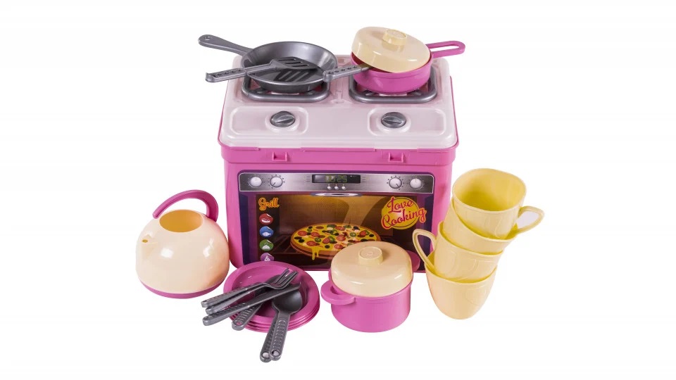 Setul contine: cratita mare si cratita mica, tigaie, ceainic, 4 cani, 4 farfurii, 2 linguri, 2 furculite, 2 cutite, lopatica si polonic.