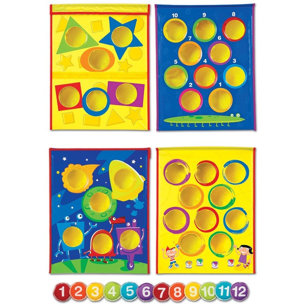 Sa inceapa distractia! 4 jocuri amuzante, prestabilite pentru intreaga familie. Insa, fiecare jucator poate crea propriul joc de potrivire a culorilor, numerelor si formelor prin aruncarea saculetilor in gaura corespunzatoare.
