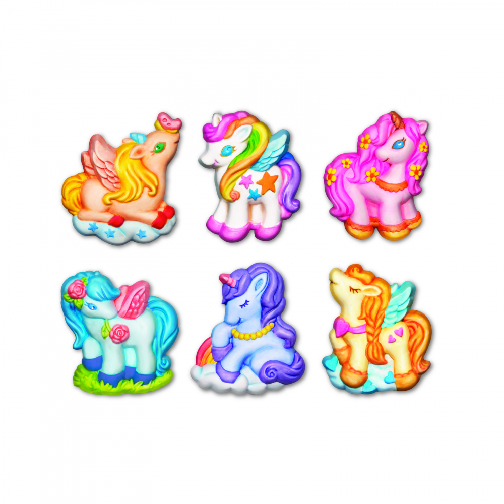 Conține 1 matriță cu 6 modele, pudră de ipsos, magneți, 2 știfturi, bandă de vopsea în 5 culori, 1 pensulă, sclipici și instrucțiuni detaliate.