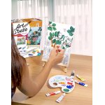 Setul contine 1 paleta, 10 culori acrilice, 1 burete, 4 cartonase pentru desen, 2 panze pentru pictura, 2 pensule, 1 sevalet din lemn si 1 manual de instructiuni.