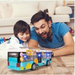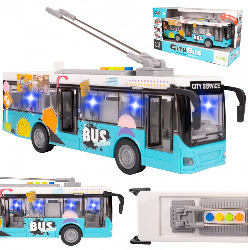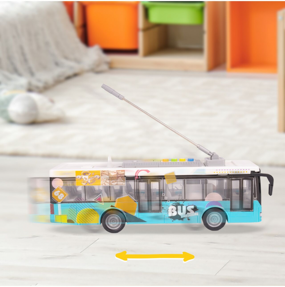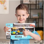 Un autobuz de oras realist, cu scara 1:16, echipat cu efecte de lumina si sunet, usor de pus in miscare prin frecare si cu usi care se deschid, pentru o experienta de joc interactiva si plina de imaginatie.