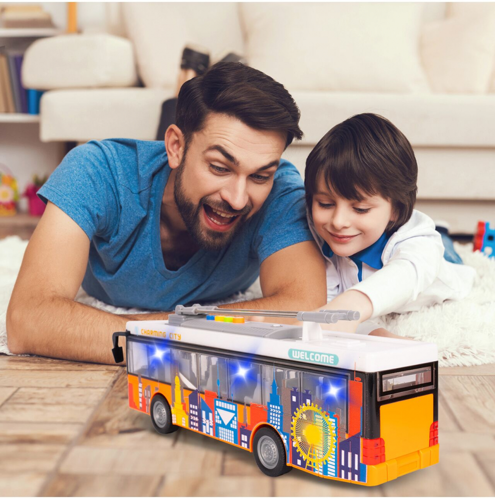 Un autobuz de oras realist, cu scara 1:16, echipat cu efecte de lumina si sunet, usor de pus in miscare prin frecare si cu usi care se deschid, pentru o experienta de joc interactiva si plina de imaginatie.