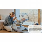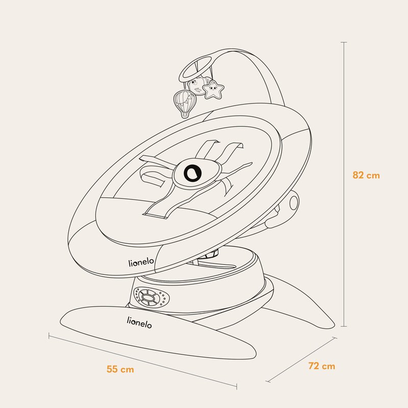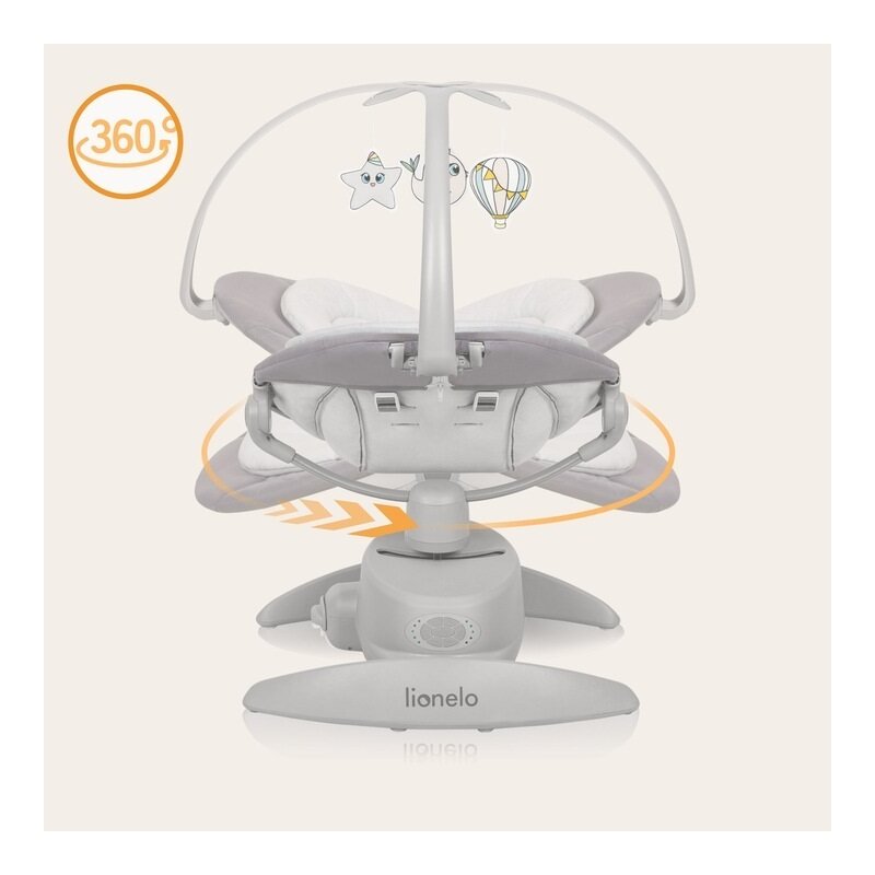 Balansoarul are 12 melodii presalvate si 2 sunete naturale cu reglare a volumului. Conectivitatea Bluetooth permite redarea melodiilor selectate pentru copil. Bara de jucarie detasabila si reglabila, completata cu un set de jucarii, il tine pe micut distrat si il incurajeaza sa ajunga si sa isi intinda bratele.