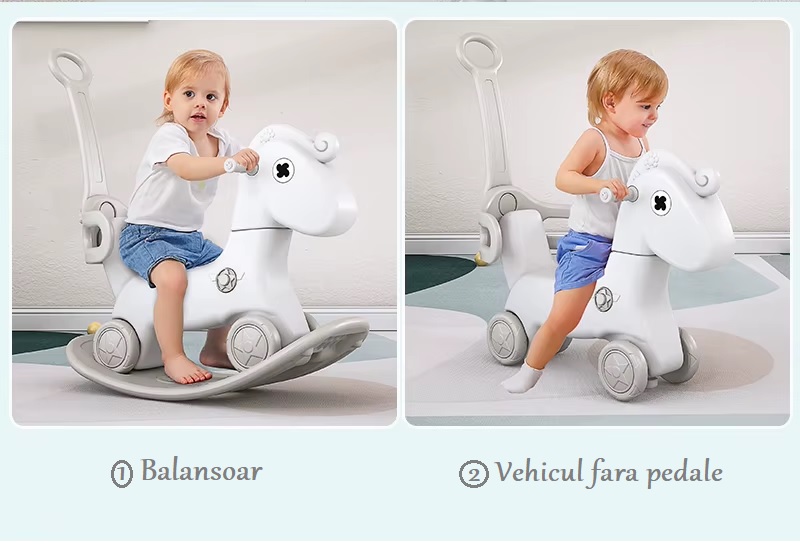 Calutul poate fi folosit ca balansoar sau pentru plimbat pe rotile, talpa fiind detasabila.