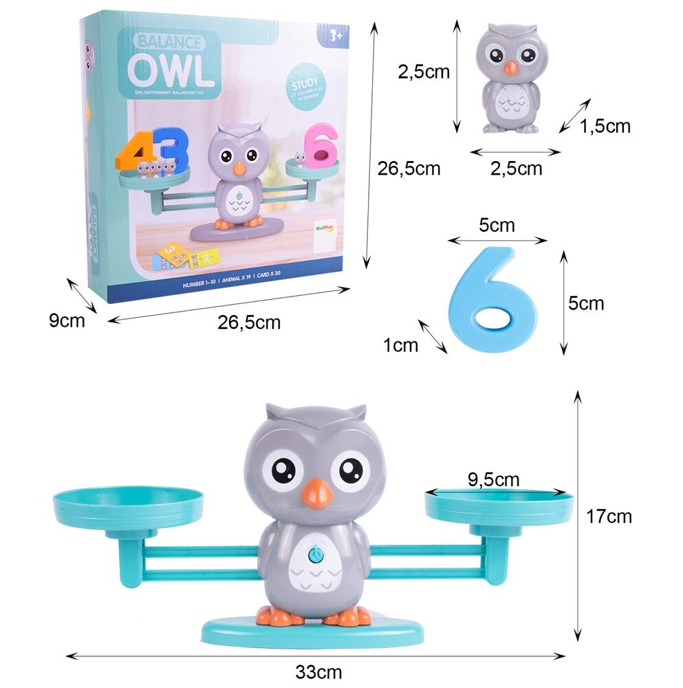 * Cât cântărește? Privește minunile pe care le ascunde această jucărie: un cântar colorat cu o figurină a unei bufnițe mari, greutăți în formă de bufnițe mici, numere și carduri cu sarcini îți vor oferi ore întregi de distracție interesantă care te vor conduce la descoperiri fascinante!