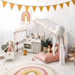 Baldachinul din muselina pentru copii se poate accesoriza cu pompoane, coronita de flori, lumini decorative, perne, saltele de joaca, ghirlande textile, saltele decorative si astfel spatiul de joaca mult visat devine realitate.