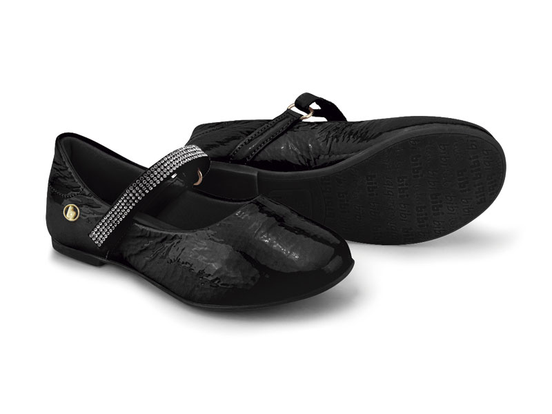 Design clasic si modern din piele lacuita, cu captuseala pe spate ce ofera confort si inchidere cu velcro impodobita cu strasuri, facand modelul super delicat si cu multa stralucire.
