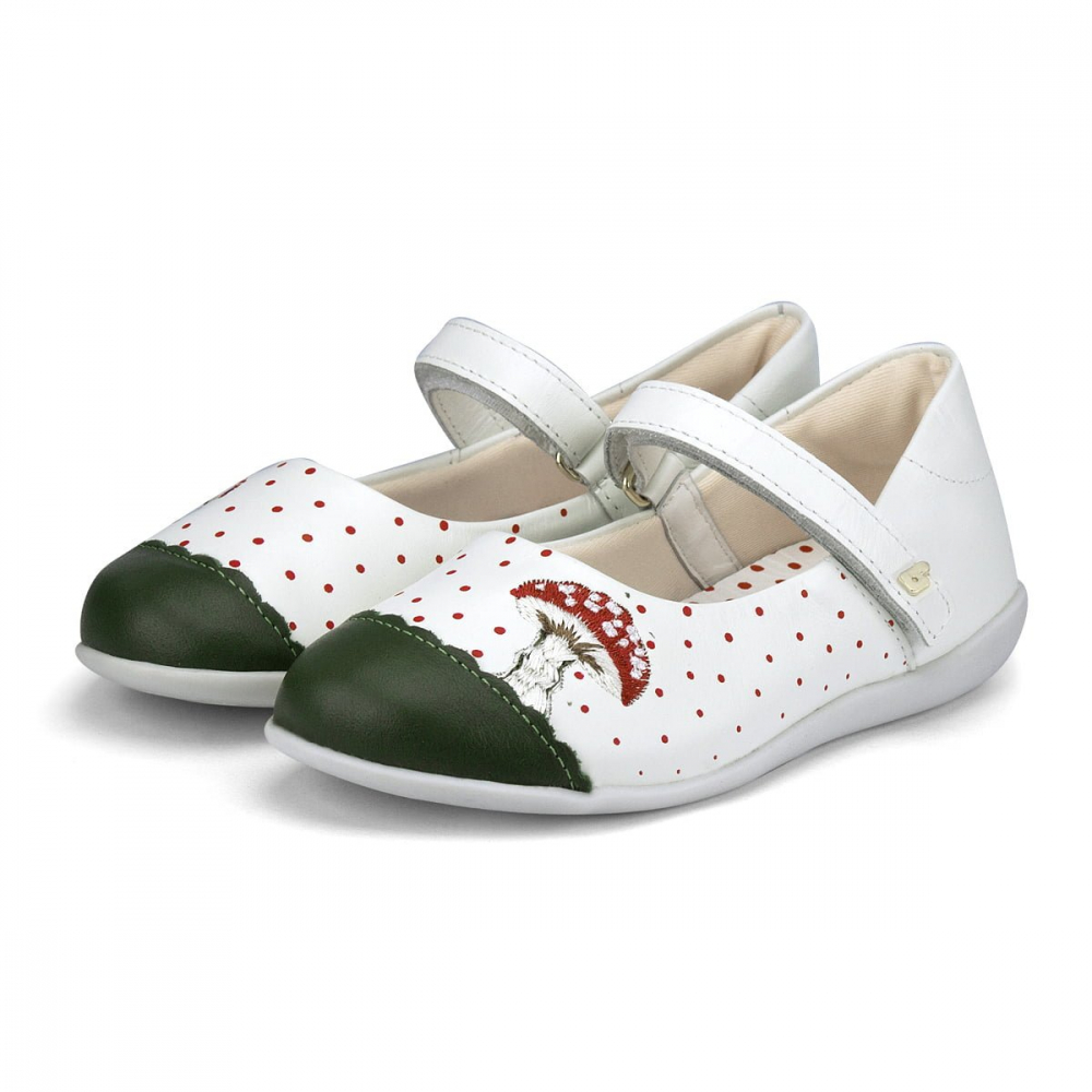 Balerini din piele cu model ciupercuta, captusiti cu material textil. Balerinii au inchidere cu velcro, pentru o incaltare facila, si brant cu tehnologie FisioFlex, pentru absorbtia socurilor si distribuirea presiunii pe talpa.