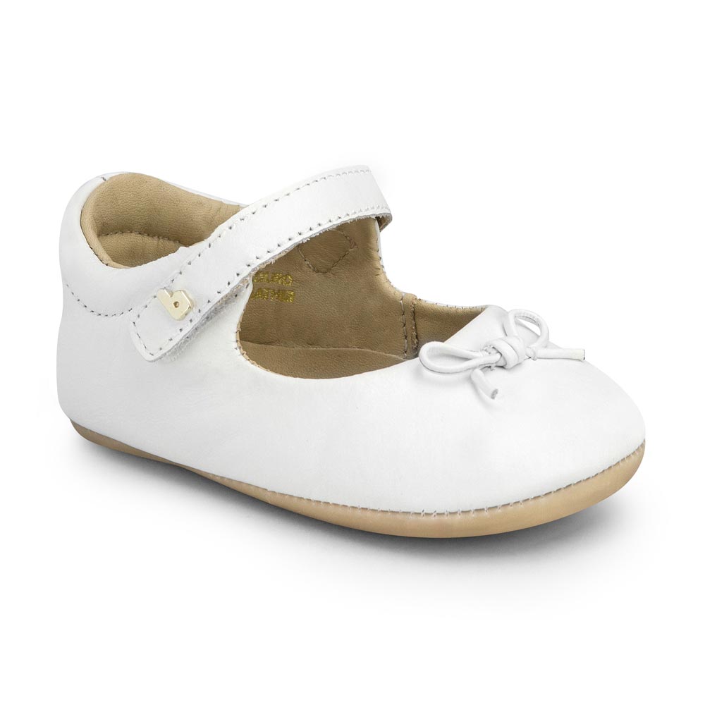 Balerini albi cu captuseala, brant si exterior din piele. Au un sistem elastic exclusiv in calcaiul incaltamintei care faciliteaza fixarea si bareta cu velcro.