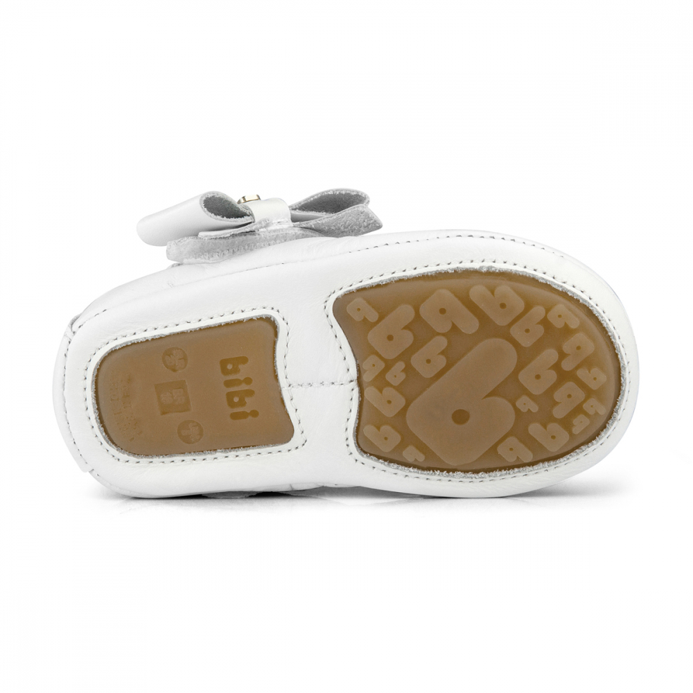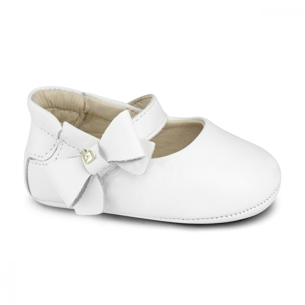 Balerini albi pentru nou nascuti si bebelusi, cu captuseala, brant si exterior din piele moale. Au un sistem elastic exclusiv in calcaiul incaltamintei care faciliteaza fixarea si inchidere cu velcro.