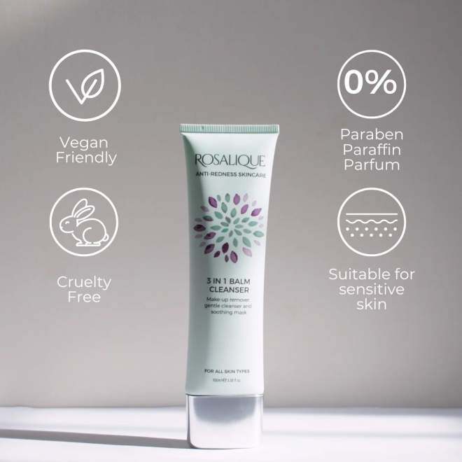 Balsamul de Curatare 3 in 1 Rosalique a fost dezvoltat special pentru cei cu piele sensibila, predispusa la roseata. Curata delicat pielea si elimina impuritatile, machiajul si poluantii fara a indeparta umiditatea naturala a pielii. Este adaugarea perfecta la rutina ta zilnica de ingrijire a pielii.