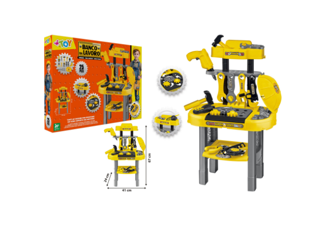 Banc de lucru cu scule pentru copii, accesorii, unelte incluse, 25 piese diferite, 67 cm inaltime, bormasina inclusa, cheie franceza, ciocan si saibe si piulite pentru infiletat si casca protectie