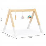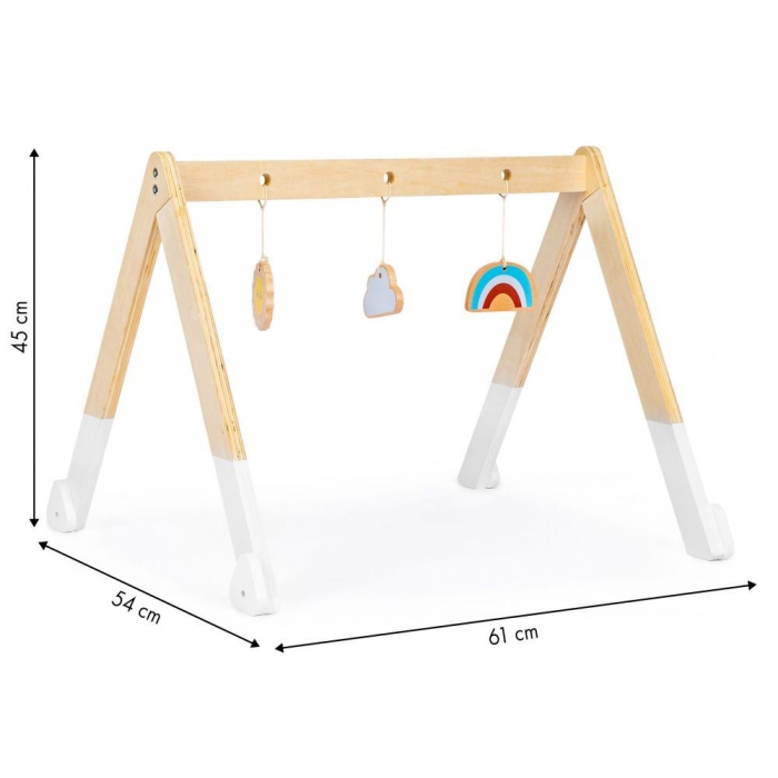 Intregul suport este din lemn, de bara transversala sunt atarnate 3 jucarii colorate. Fiecare jucarie are o forma si o culoare diferita, astfel incat copilul sa poata fi stimulat corespunzator.