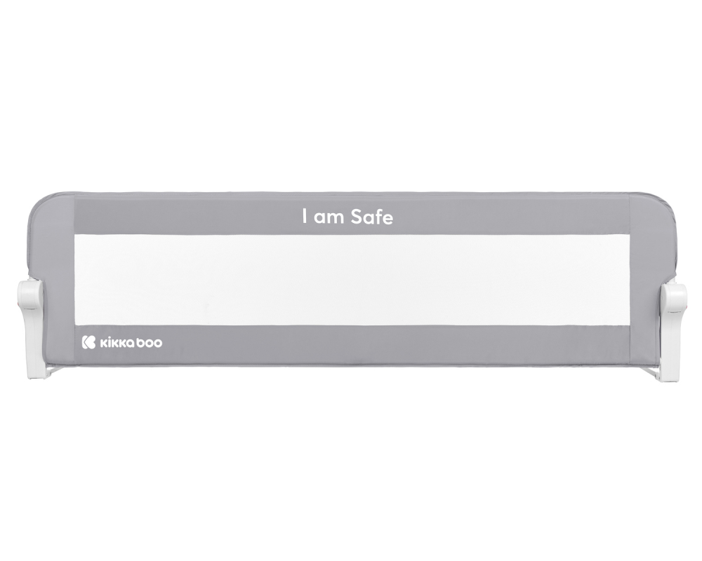 Bariera de protectie pentru pat copii KikkaBoo I am Safe Grey 150 cm,fixare stabila,rabatabila,potrivita pentru saltele de la 12-20 cm,colturi rotunjite,material textil de inalta calitate