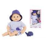 Papusa cu corp moale poarta un costum de baie dragut albastru si alb, cu o palarie de soare care poate fi, de asemenea, indepartata.