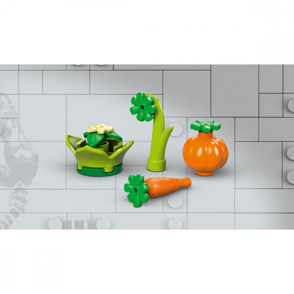 Figurina din acest set de construit-un-dinozaur include falci care se deschid, coada articulata care se leagana dintr-o parte in alta cand se misca si capul, picioare articulate, alaturi de niste legume.