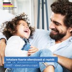 Acest aparat de aerosoli vine cu set extins de atomizoare, atât pentru adulți cât și pentru copii, este foarte silențios (aprox. 45 dB(A)) și funcționează cu acumulator litiu-ion.